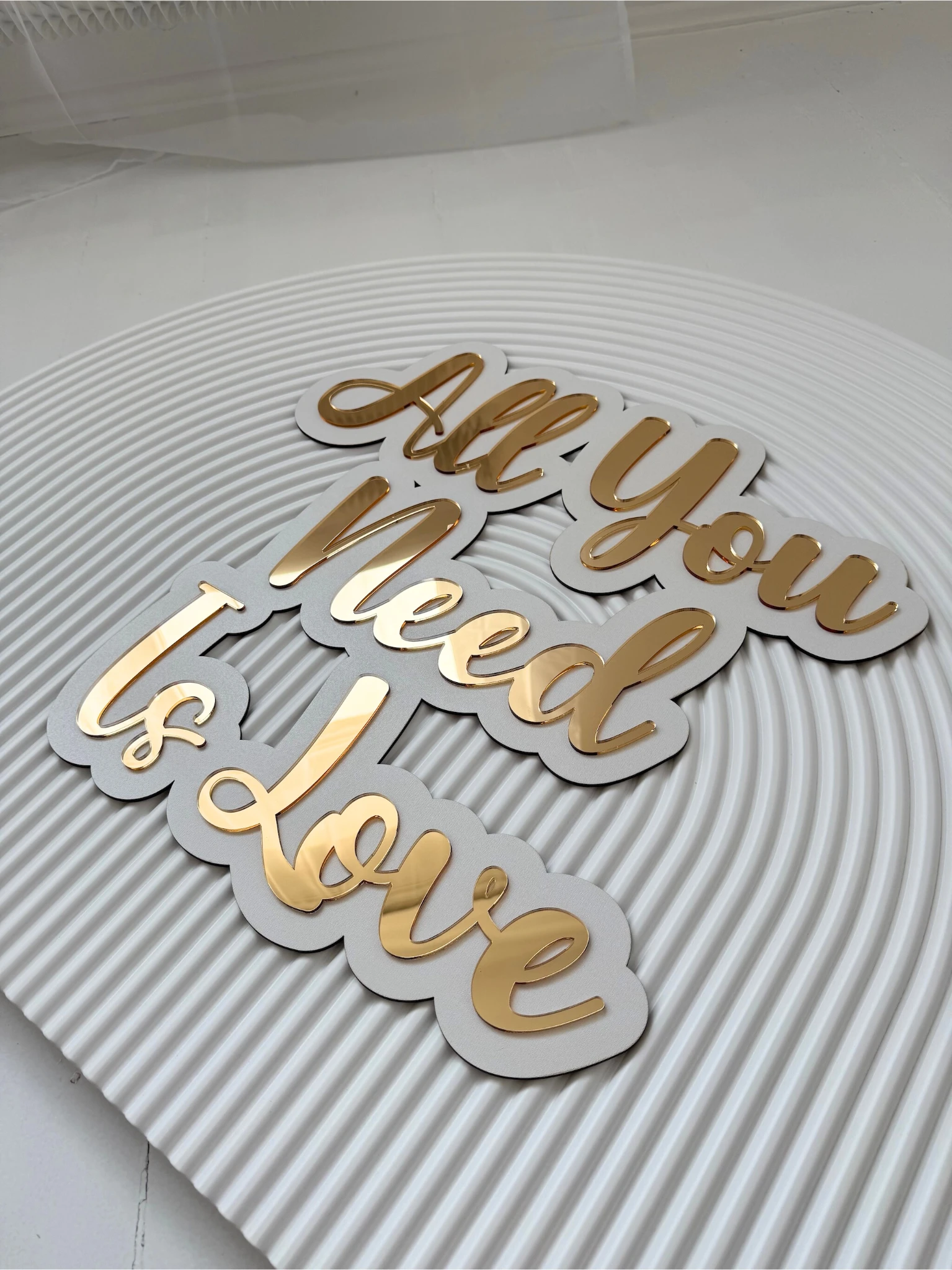 Złoty napis "All You Need Is Love" to dekoracja, która doskonale wpisuje się w najnowsze trendy ślubne, jednocześnie zachowując klasyczną elegancję. Wykonany z dbałością o detale, na białym tle – prezentuje się wyjątkowo estetycznie i stylowo.