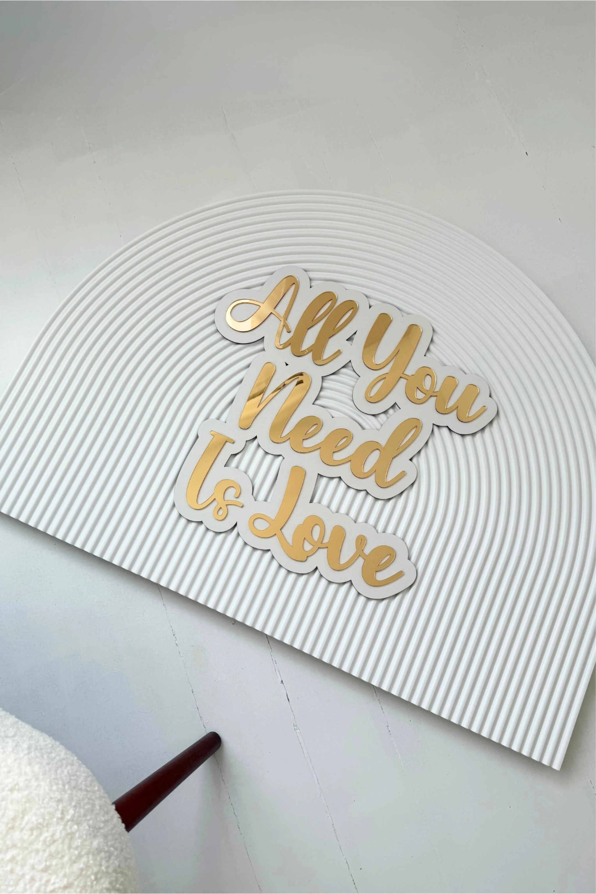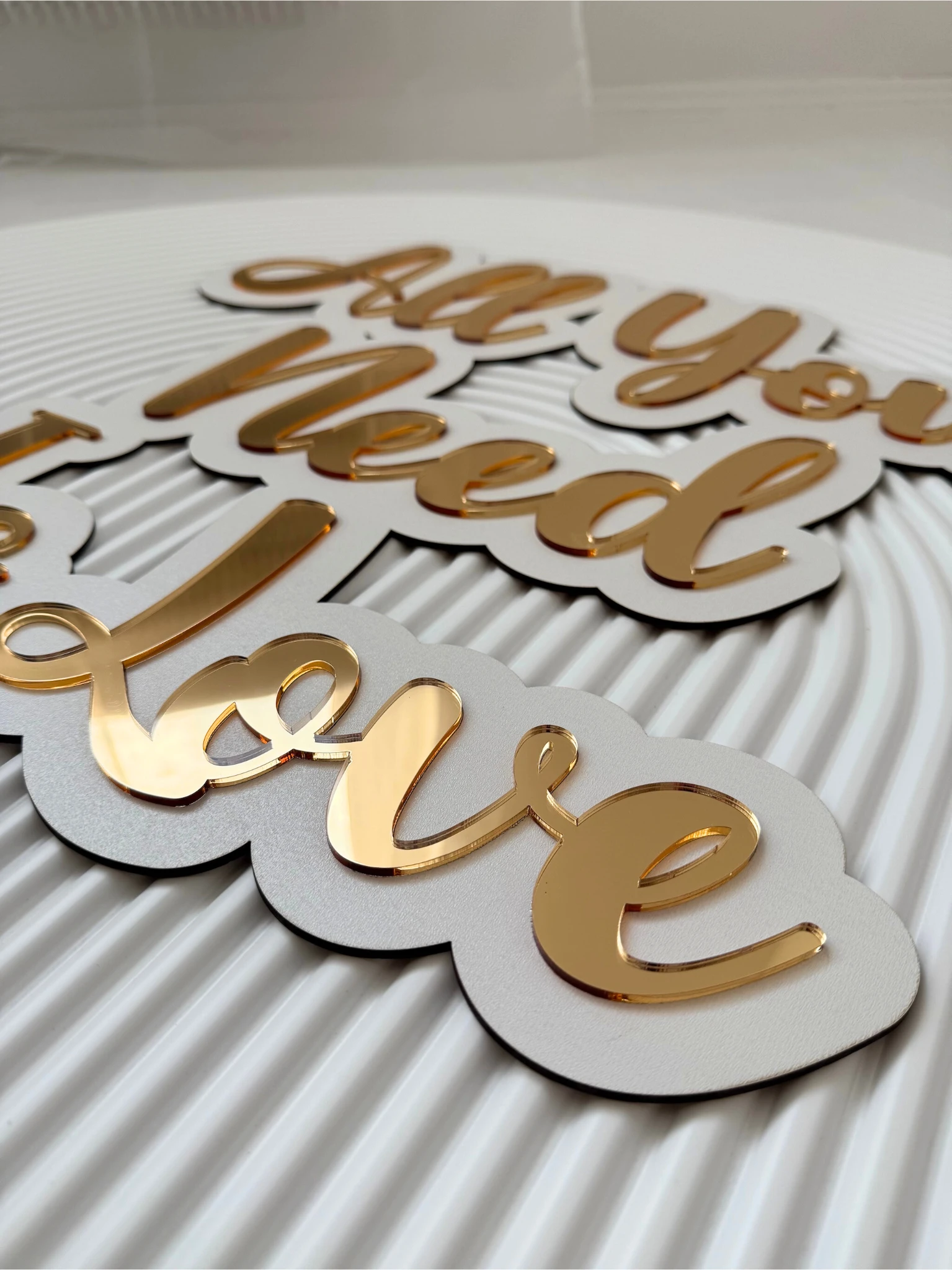 Złoty napis "All You Need Is Love" na białym tle – klasyka z nutą elegancji
