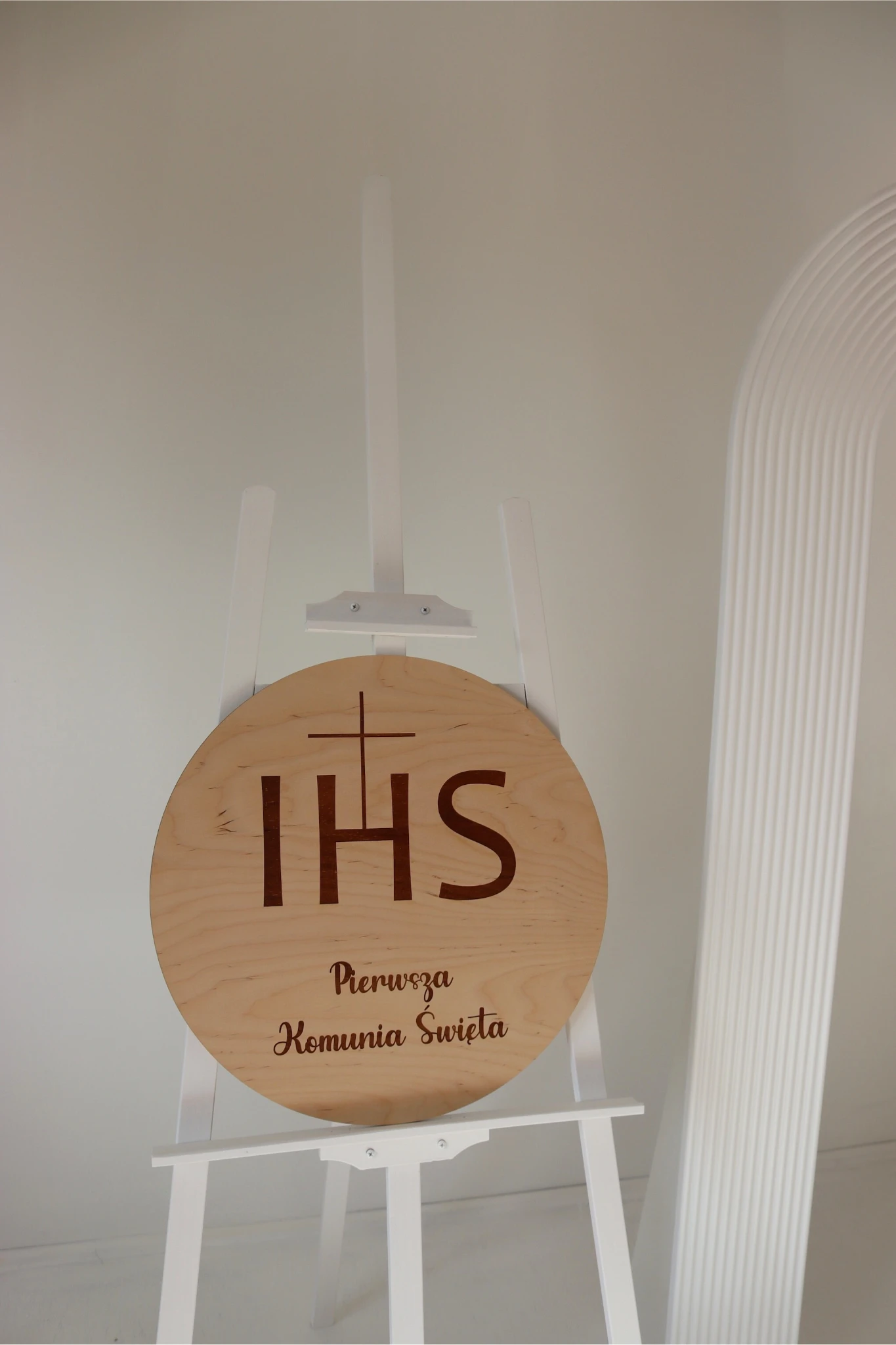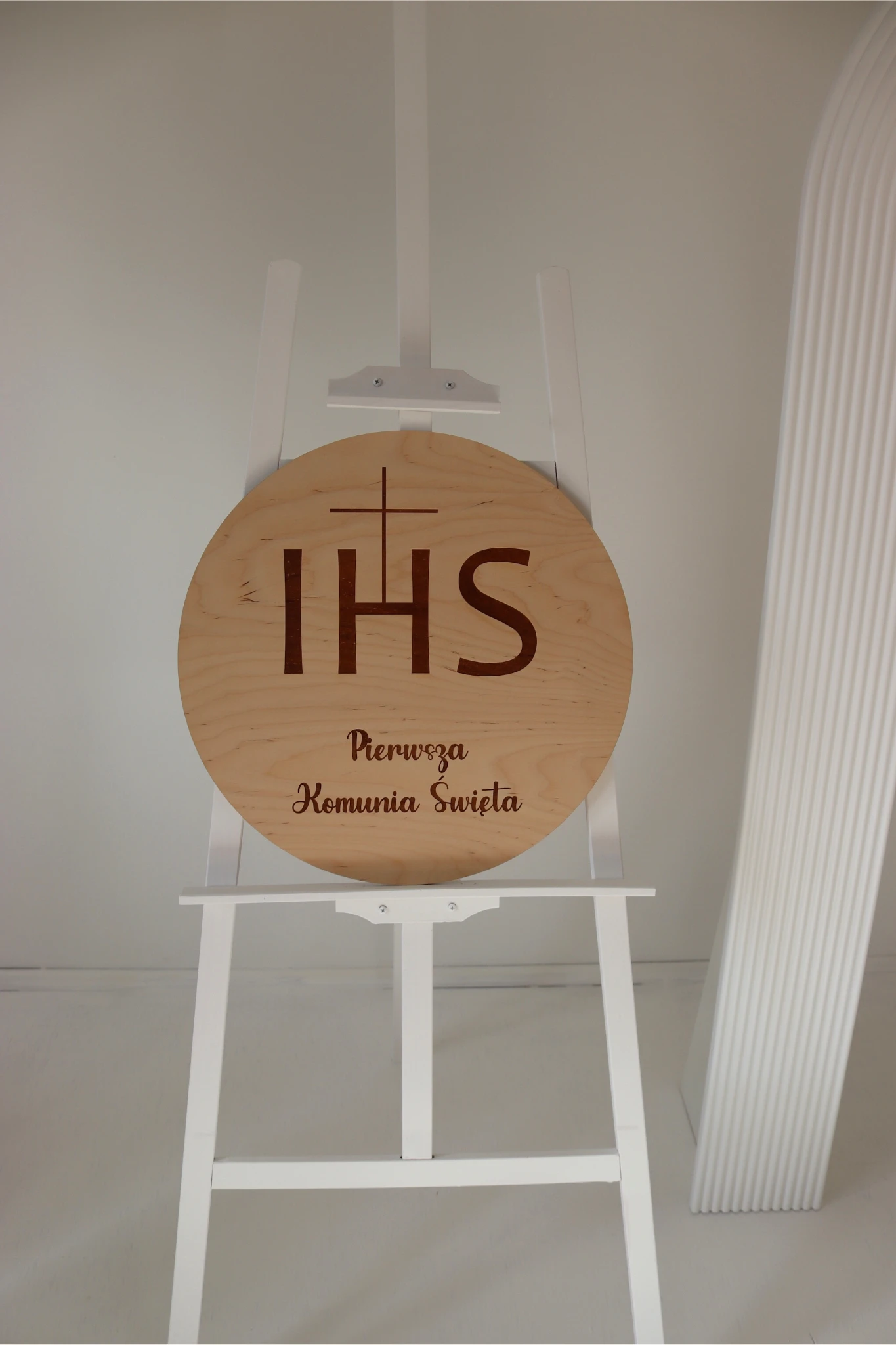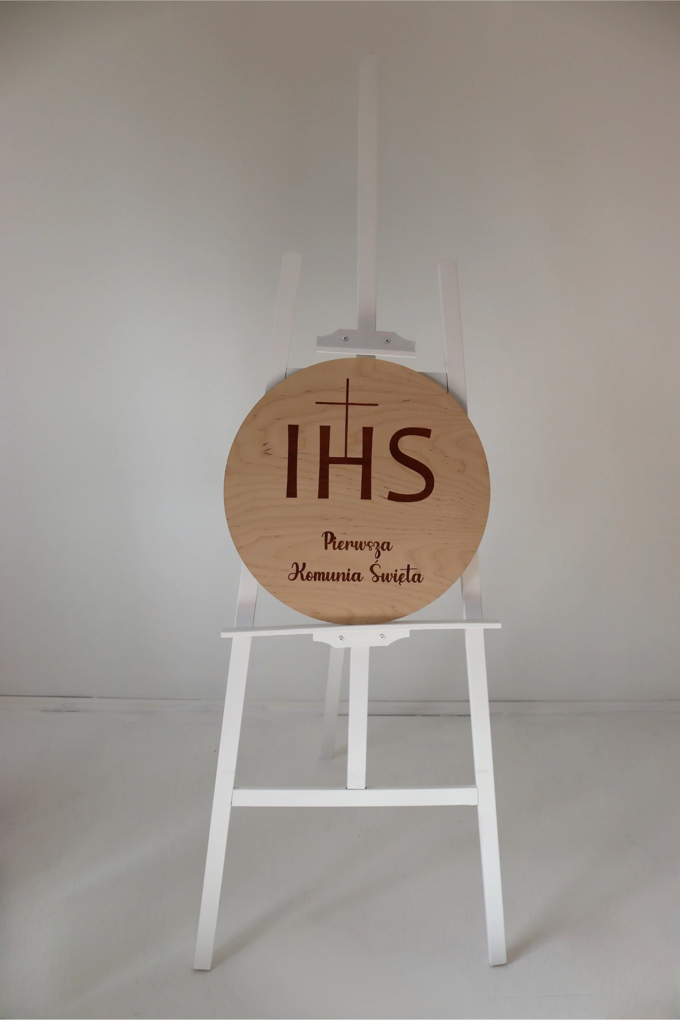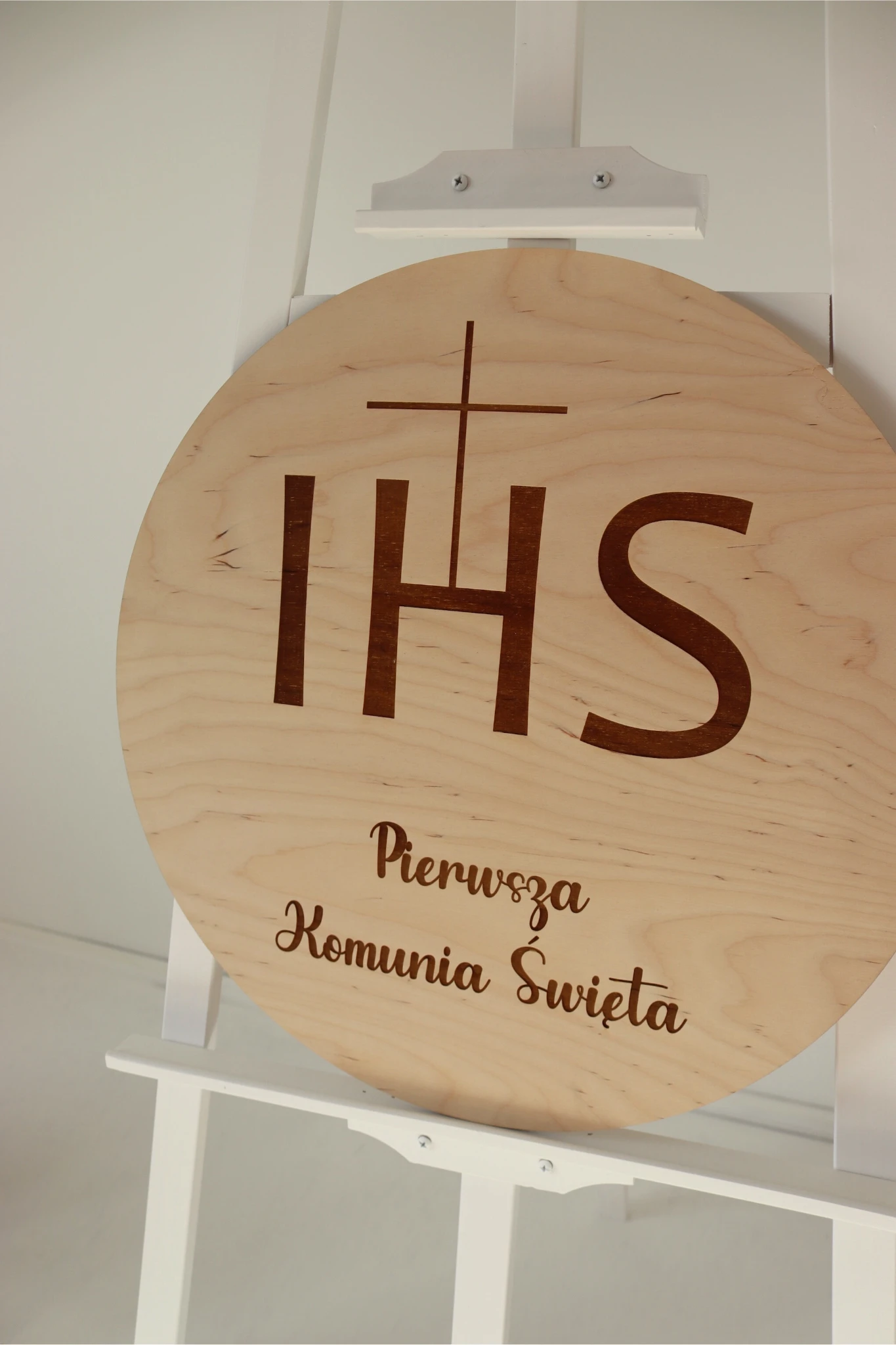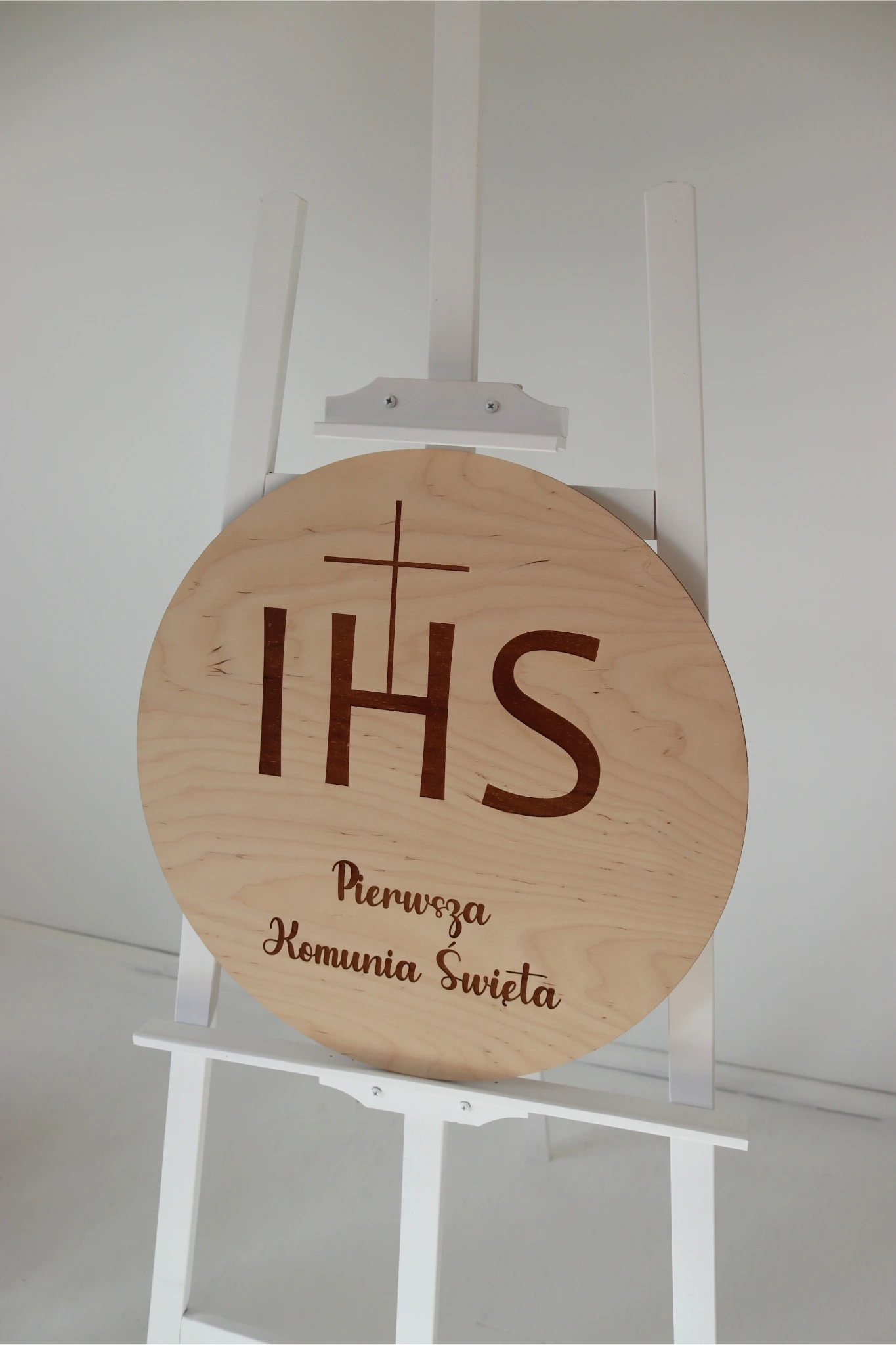 Dekoracyjne koło z napisem „IHS Pierwsza Komunia Święta”