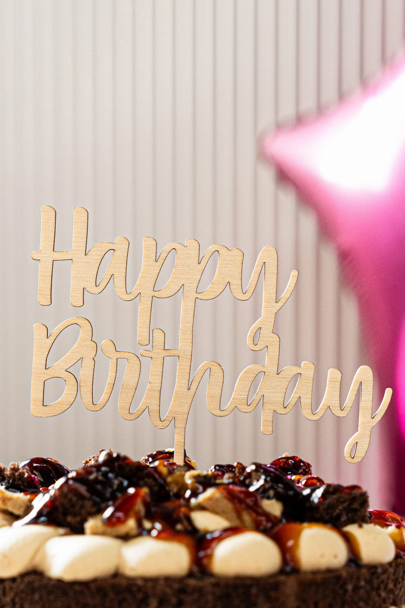 Drewniany topper ze sklejki – naturalny, ciepły wygląd, doskonale wpisujący się w styl rustykalny, boho czy eko. Idealny do delikatnych dekoracji lub tortów w stylu naked cake.
